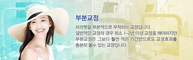 ÀϹÝÀûÀÎ ±³Á¤ÀÇ °æ¿ì ÃÖ¼Ò 1~2³â ÀÌ»ó ±³Á¤À» ÇØ¾ßÇÏÁö¸¸ ºÎºÐ±³Á¤Àº ±×º¸´Ù ÈξÀ ÀûÀº ±â°£¸¸À¸·Îµµ ±³Á¤È¿°ú¸¦ ÃæºÐÈ÷ º¼¼ö ÀÖ´Â ±³Á¤ÀÔ´Ï´Ù. ºê¶óÄÏÀ» ºÎºÐÀûÀ¸·Î ºÎÂøÇØ¼ ÀüüÀûÀÎ ±³Á¤°ú ´Þ¸® ¹ßÀ½ÀÌ ÁÁÁö ¾Ê´Ù°Å³ª ½ÉÇÑ À̹°°¨Àº ´À²¸ÁöÁö ¾Ê´Â´Ù´Â ÀåÁ¡ÀÌ ÀÖ½À´Ï´Ù.